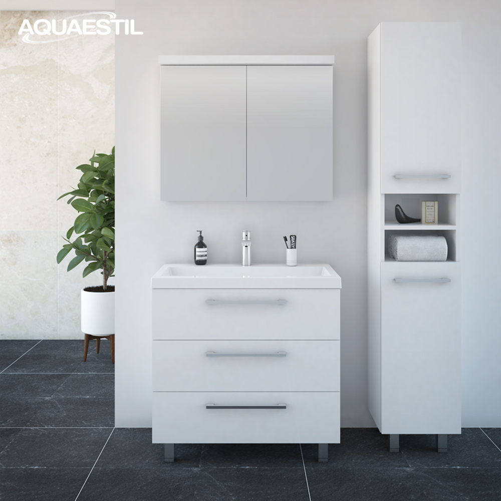 Die Waschbecken der Aquaestil Badezimmermöbel bestehen aus Mineralguss oder, in bestimmten Serien, aus Keramik. Für die Reinigung und Pflege der Aquaestil Waschbecken können Sie das Aquaestil Reinigungsmittel für Acryl- und Glasflächen oder ein standardmäßiges Badezimmer-Reinigungsmittel verwenden. Zur Entfernung von Kalk empfehlen wir Essig oder spezielle Mittel zur Kalkentfernung, die keine Mikrogranulate enthalten, die die Oberfläche des Waschbeckens zerkratzen könnten.