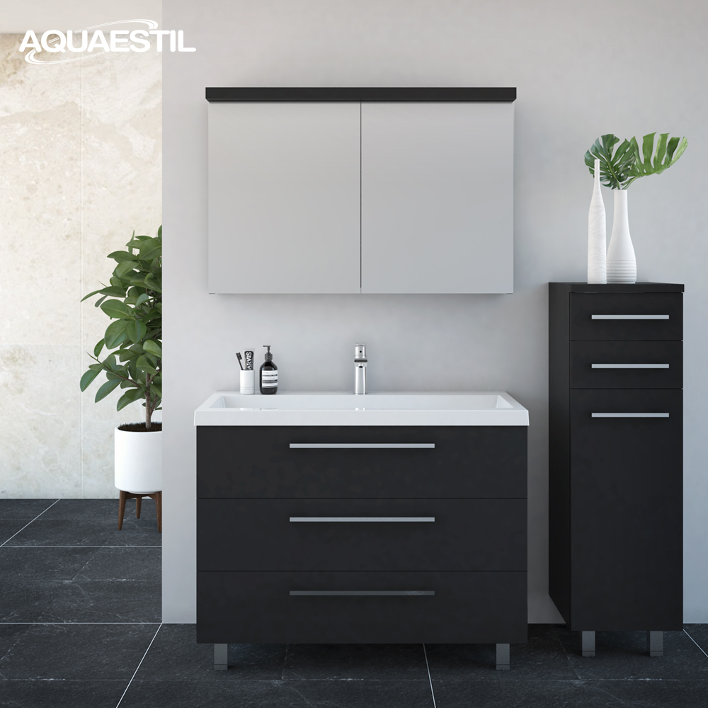 Das Material der Aquaestil Badezimmermöbel ist feuchtigkeitsbeständig, aber nicht vollständig wasserfest. Langfristige Exposition gegenüber hohen Feuchtigkeits- und Wasserwerten kann zu einem Aufquellen der Kanten der Holzbestandteile und zu einer möglichen Korrosion der Spiegel führen.