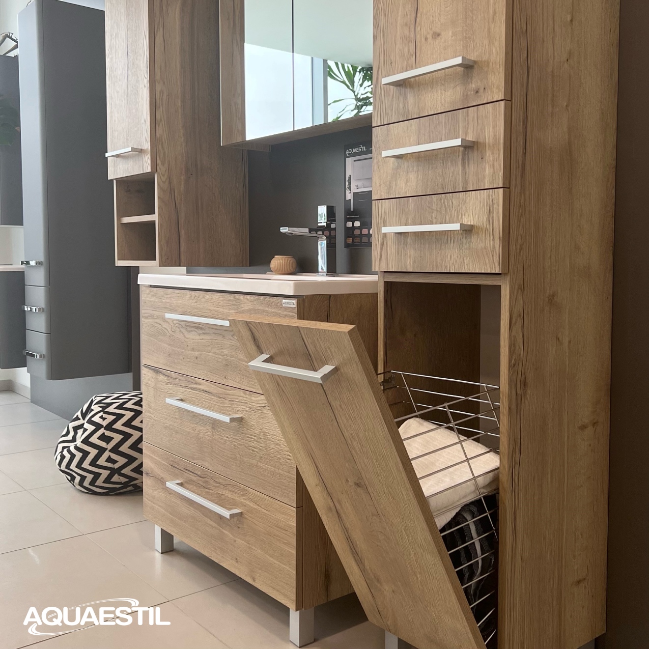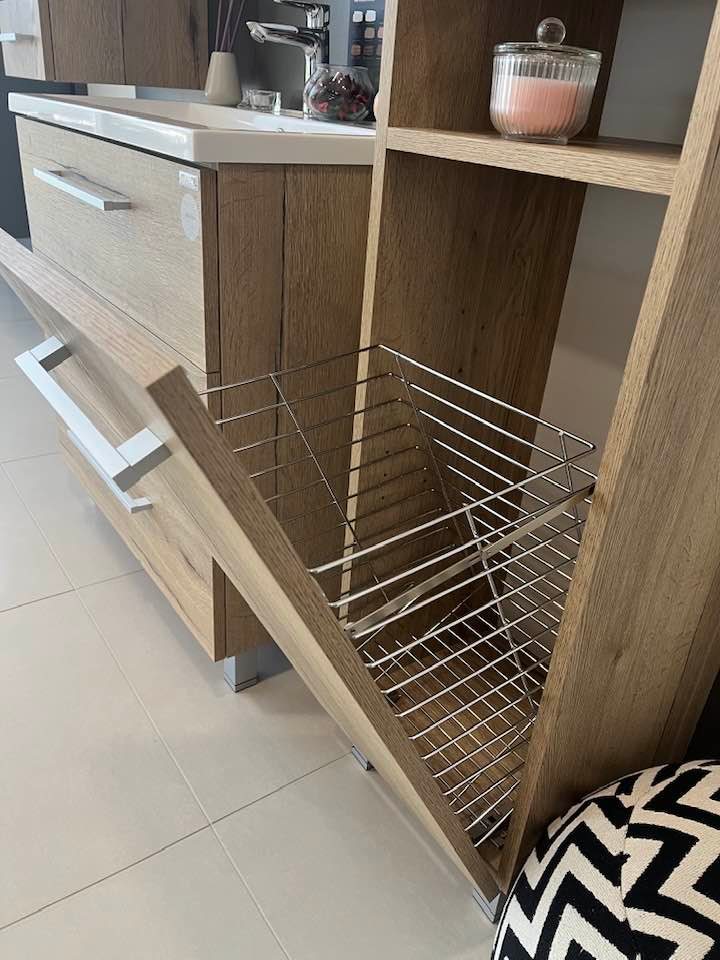 Das Astra ist ein modernes Badezimmermöbel mit Beinen, das Ihnen zusätzlichen Stauraum in Form einer Grundfläche mit drei Schubladen bietet. Diese Möbellinie besteht aus vielen Elementen, die miteinander kombiniert werden können, und die meisten Säulen Ihrer Wahl können immer mit einem nützlichen Schmutzwäschekorb ausgestattet werden. Die Spiegel verfügen über eine komfortable LED-Beleuchtung und viel Stauraum.