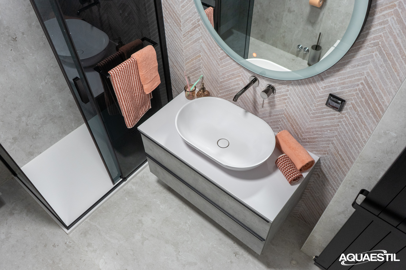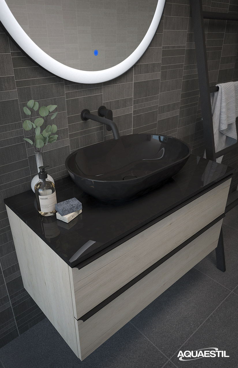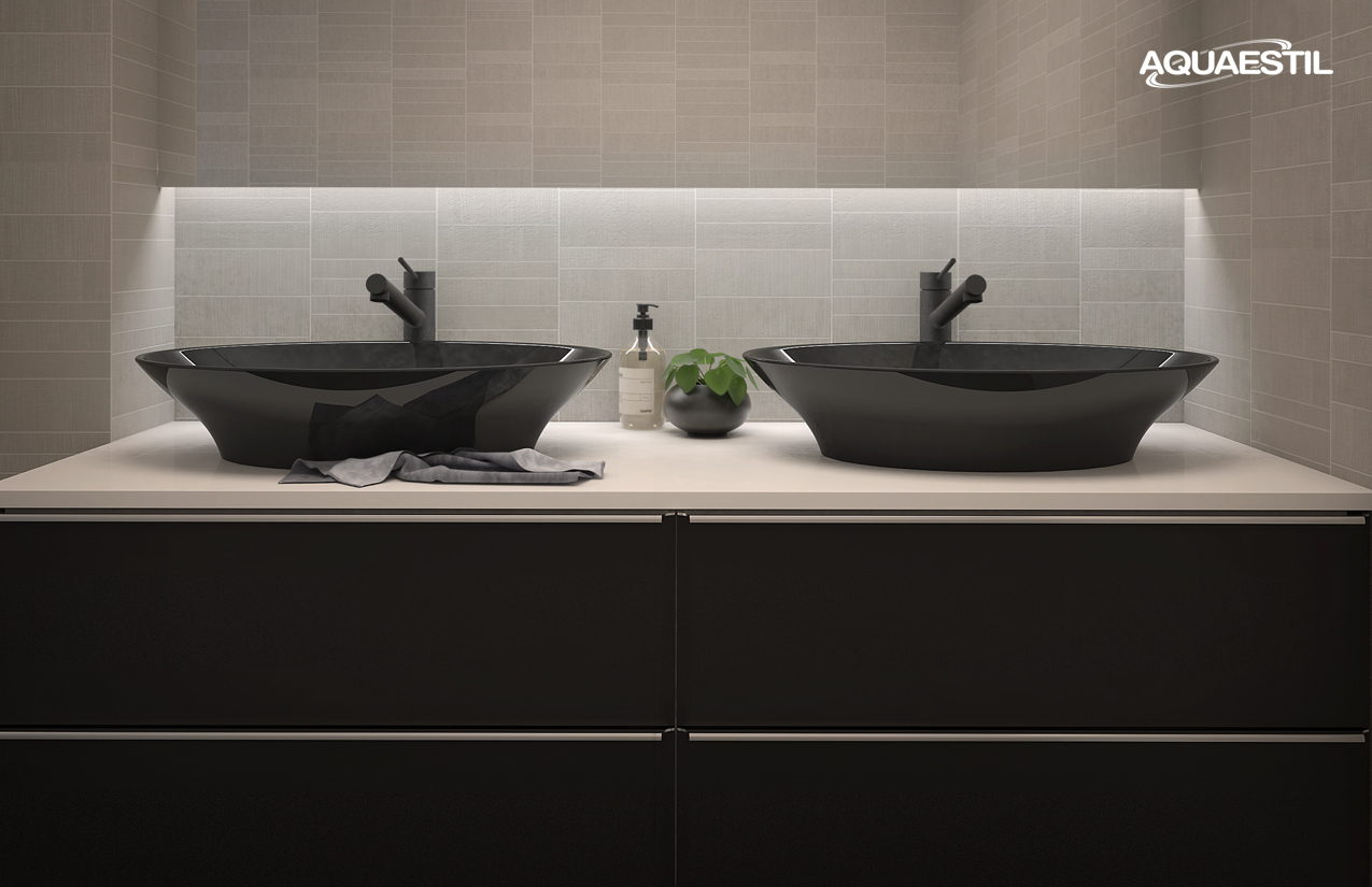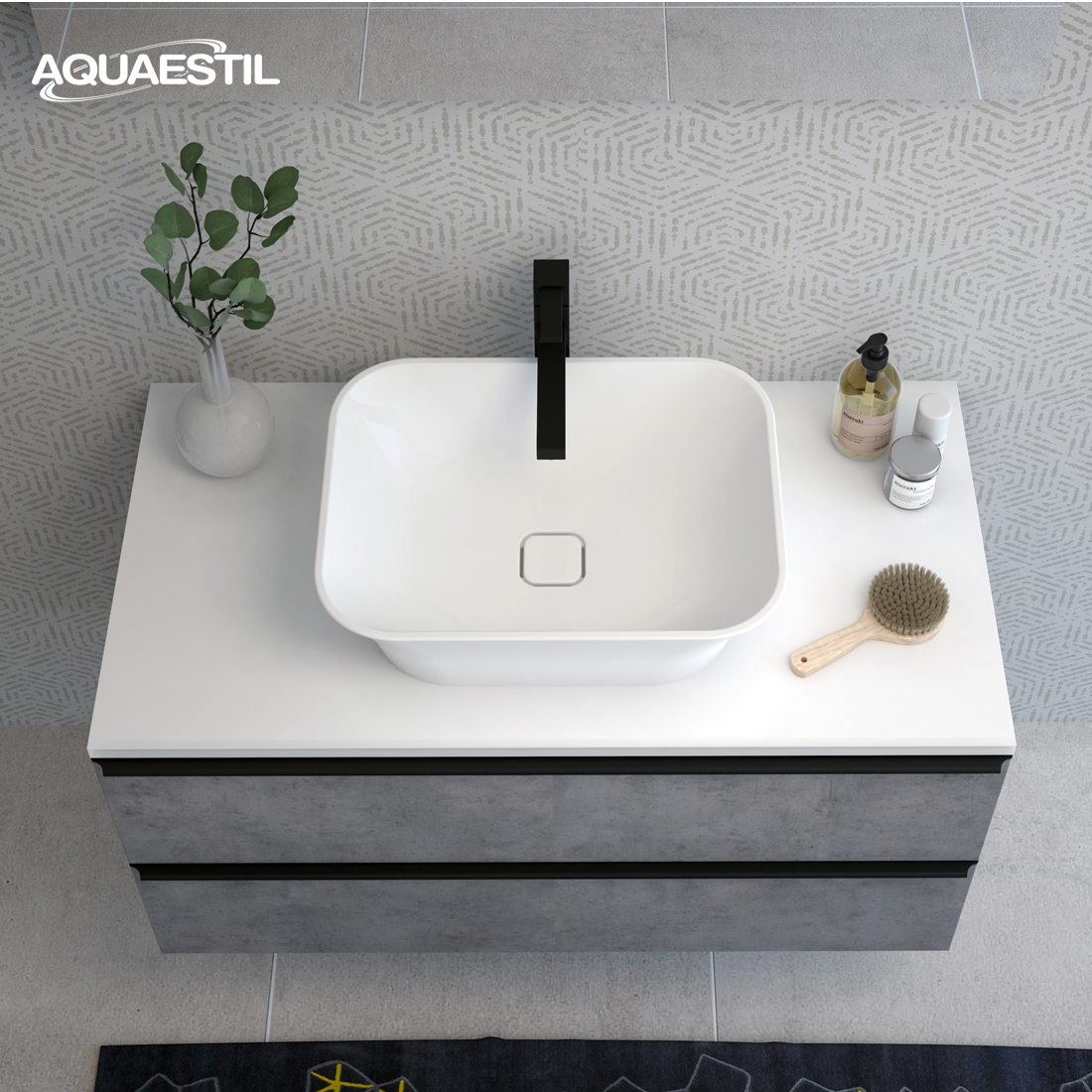 Die Waschbecken der Aquaestil Badezimmermöbel bestehen aus Mineralguss oder, in bestimmten Serien, aus Keramik. Für die Reinigung und Pflege der Aquaestil Waschbecken können Sie das Aquaestil Reinigungsmittel für Acryl- und Glasflächen oder ein standardmäßiges Badezimmer-Reinigungsmittel verwenden. Zur Entfernung von Kalk empfehlen wir Essig oder spezielle Mittel zur Kalkentfernung, die keine Mikrogranulate enthalten, die die Oberfläche des Waschbeckens zerkratzen könnten.