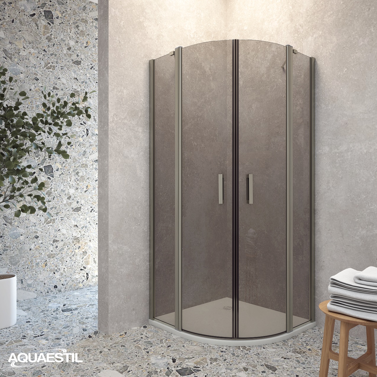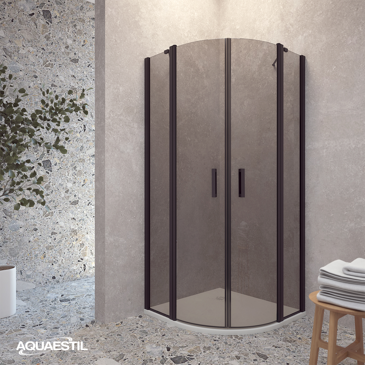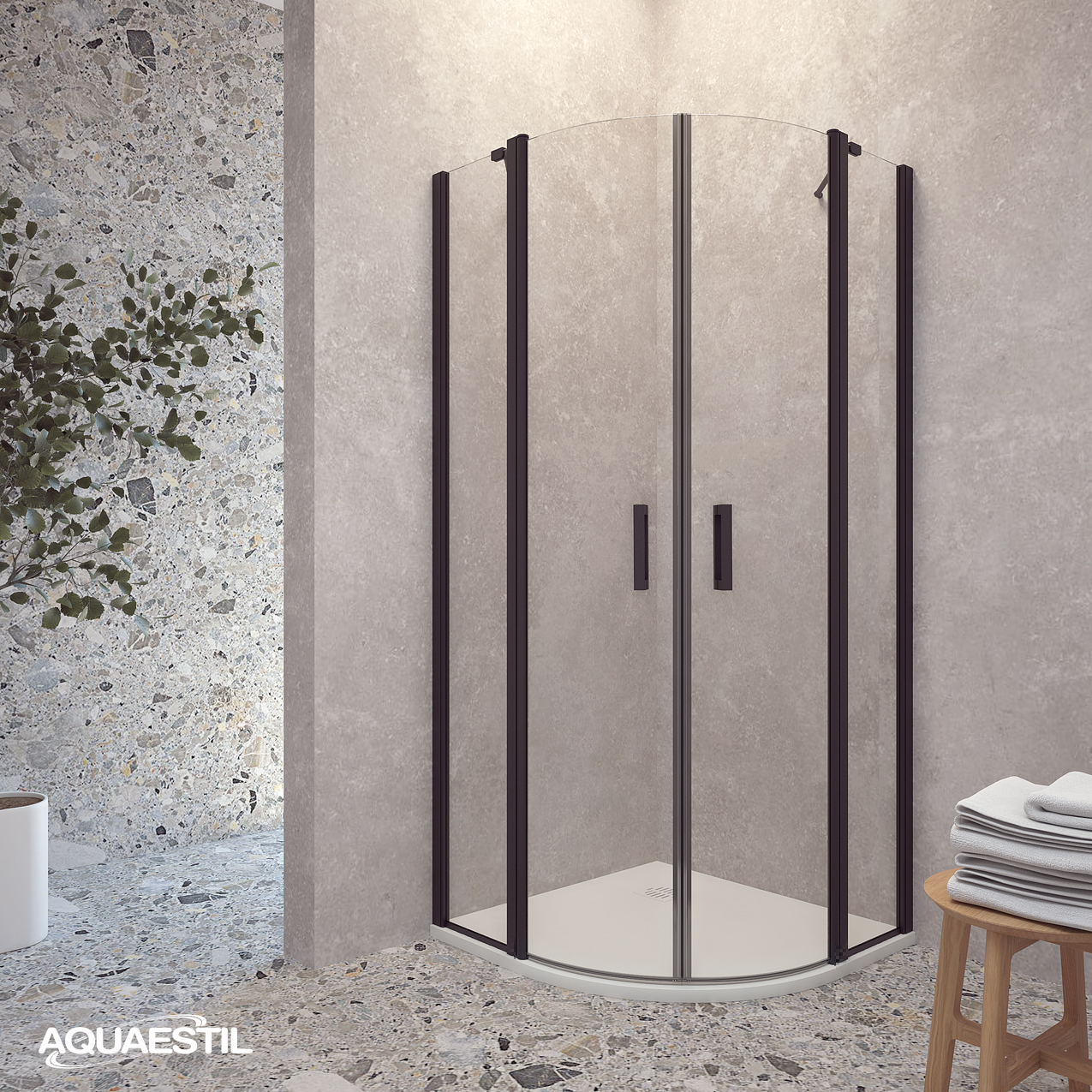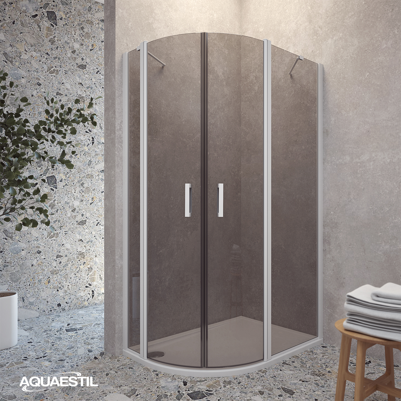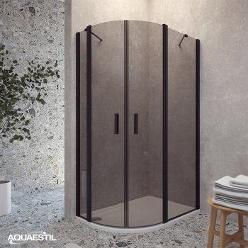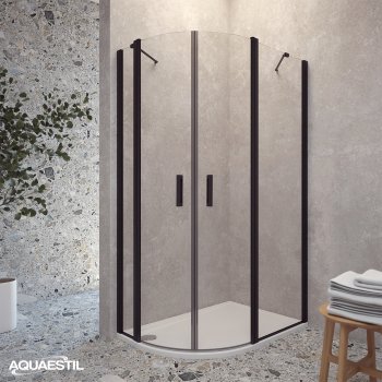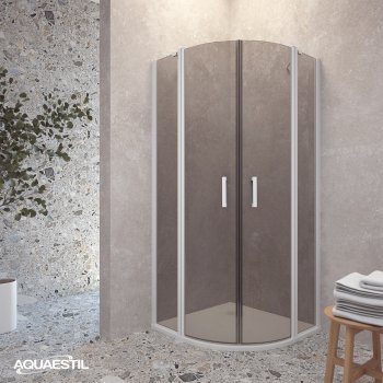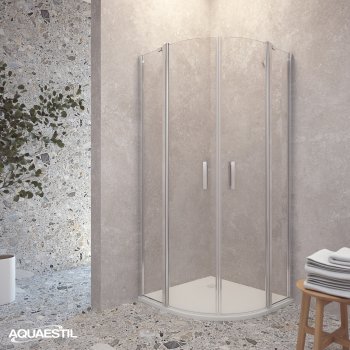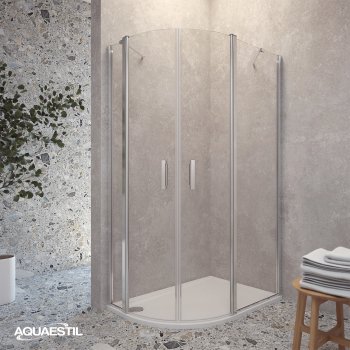 Moderner halbkreisförmiger Duschabtrennung, bestehend aus zwei „D“-Seiten mit Türen. Jede Seite besteht aus einer Drehtür und einem festen Element. Die Abtrennung ist mit eleganten Profilen in Silber, Schwarz-Matt oder Weiß-Matt und 6 mm gehärtetem Glas mit werkseitig aufgetragener Nano-Beschichtung gegen Kalk ausgestattet. Magnetdichtungen und ein Hebe-Türsystem gewährleisten hervorragende Funktionalität und Spritzwasserschutz.