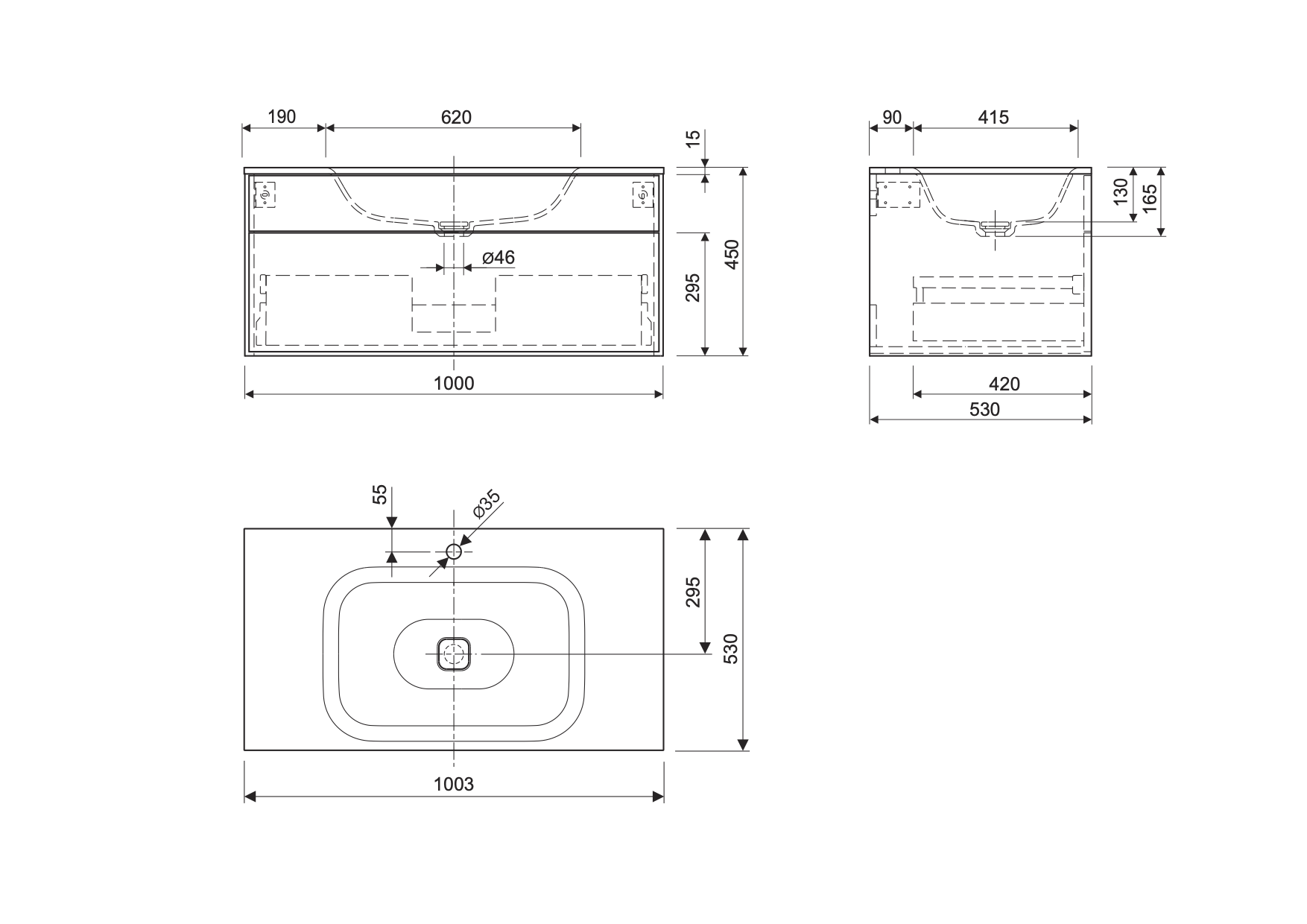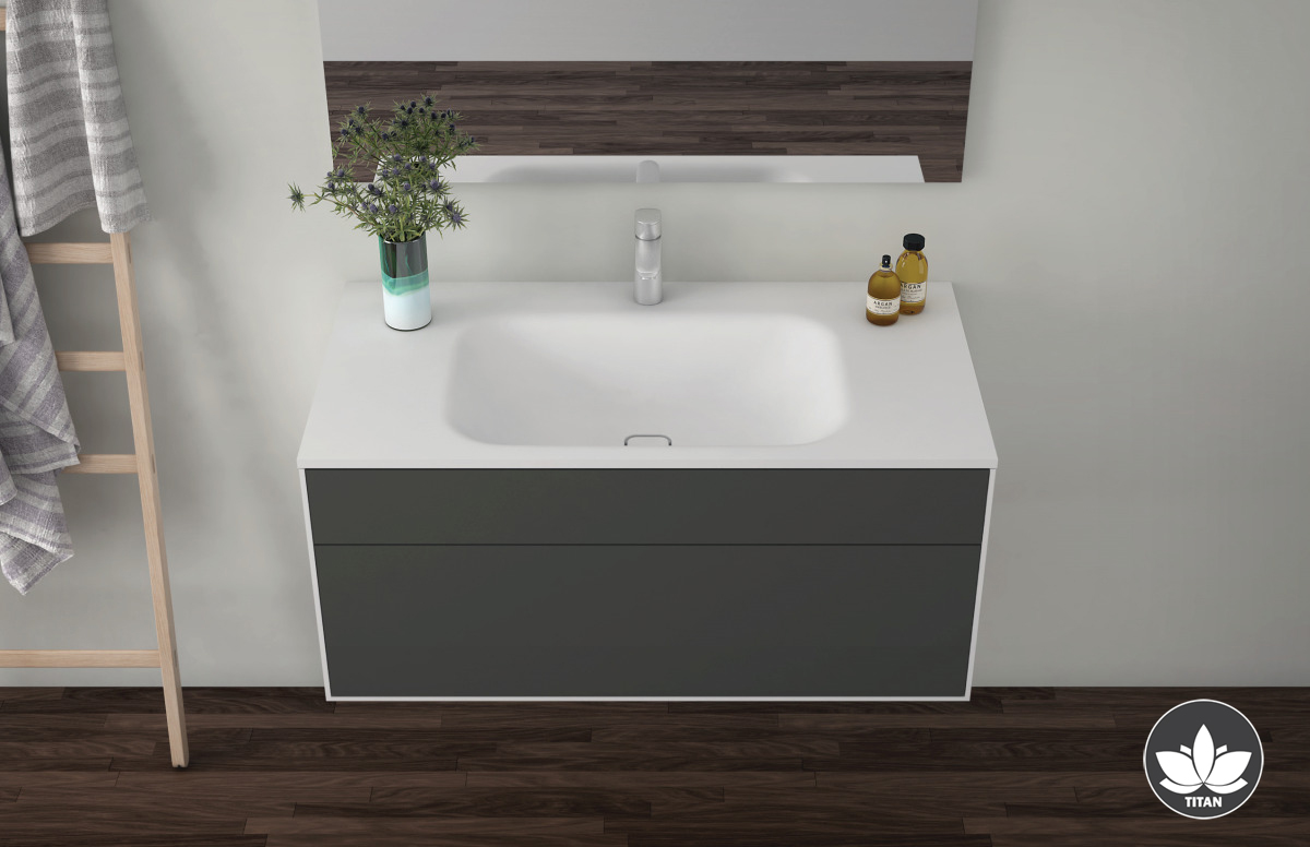 The Titan I premium bathroom furniture consists of a single or double basin and a vanity unit made of the ASTONE composite material, with a front comprising one or two drawers available in a variety of colours and styles.