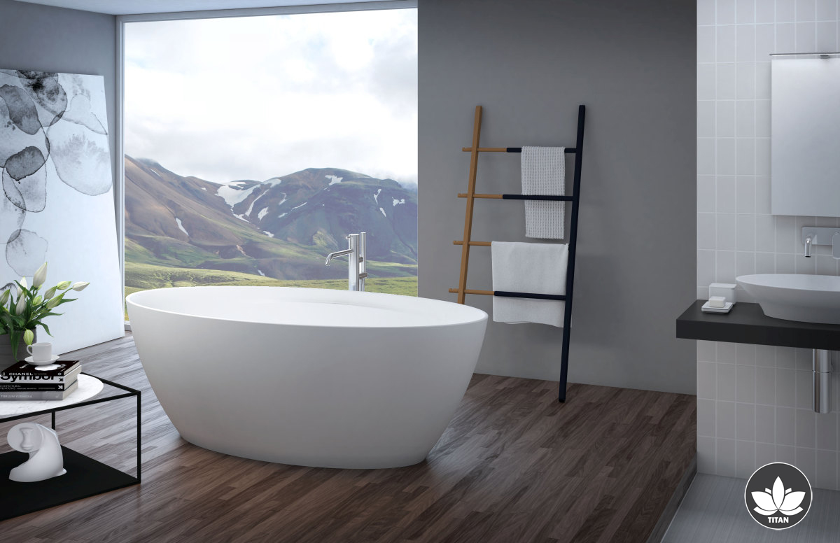 The compact yet extremely spacious Titan oval freestanding bathtub accentuates the attractive lines gained through careful processing of the ASTONE material.