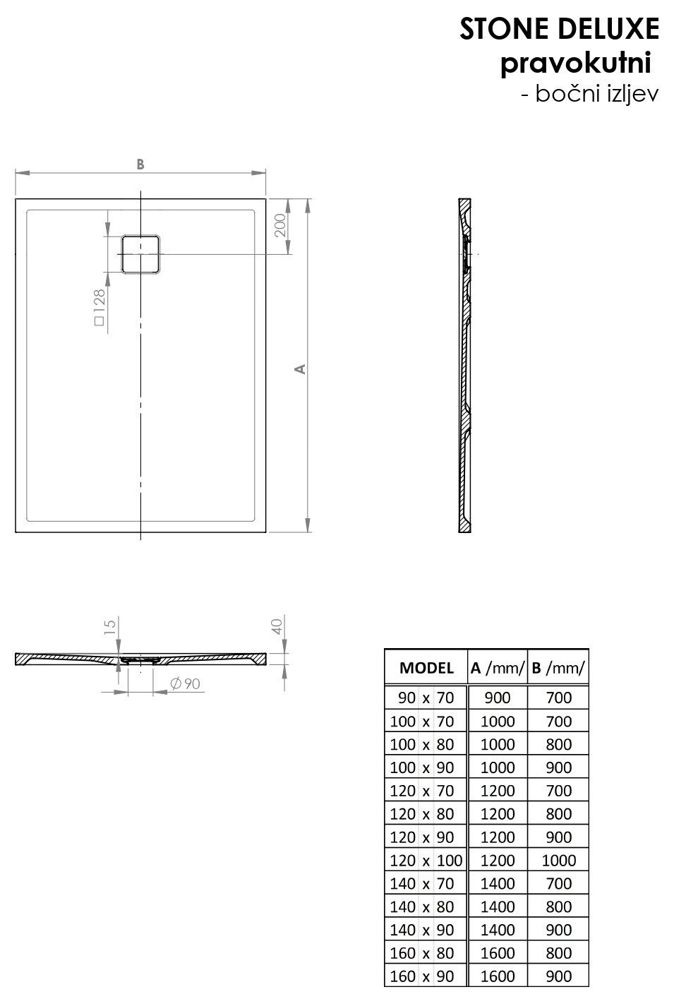 Tuš kade Stone DeLuxe od lijevanog mramora nude čvrstu i sofisticiranu površinu koja imitira beton u bijeloj, bež, crnoj ili cement sivoj boji. Atraktivan poklopac sifona izveden u identičnom efektu kao i površina tuš kade pridonosi karakterističnom izgledu Stone DeLuxe tuš kada. Posebna prednost tuš kada Stone DeLuxe je mogućnost rezanja do određenih gabarita radi prilagodbe specifičnoj konfiguraciji prostora za tuširanje.