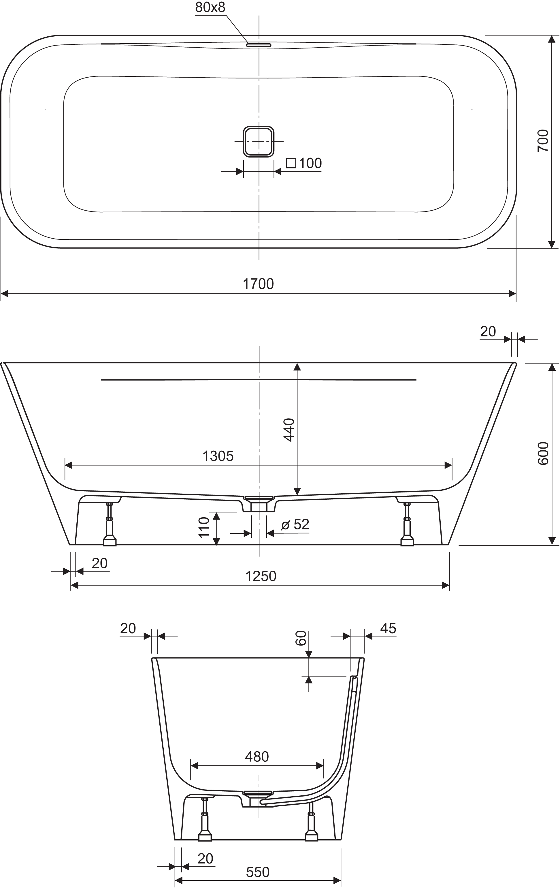 - La vasca viene fornita con gambe montate e kit con colonna di scarico con erogazione ed erogatore “slot” e con piletta di scarico clic-clac.