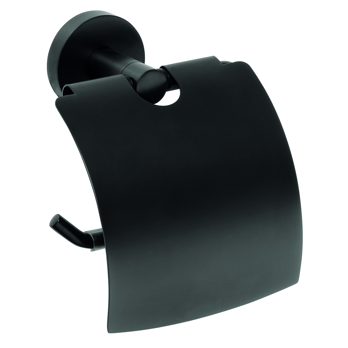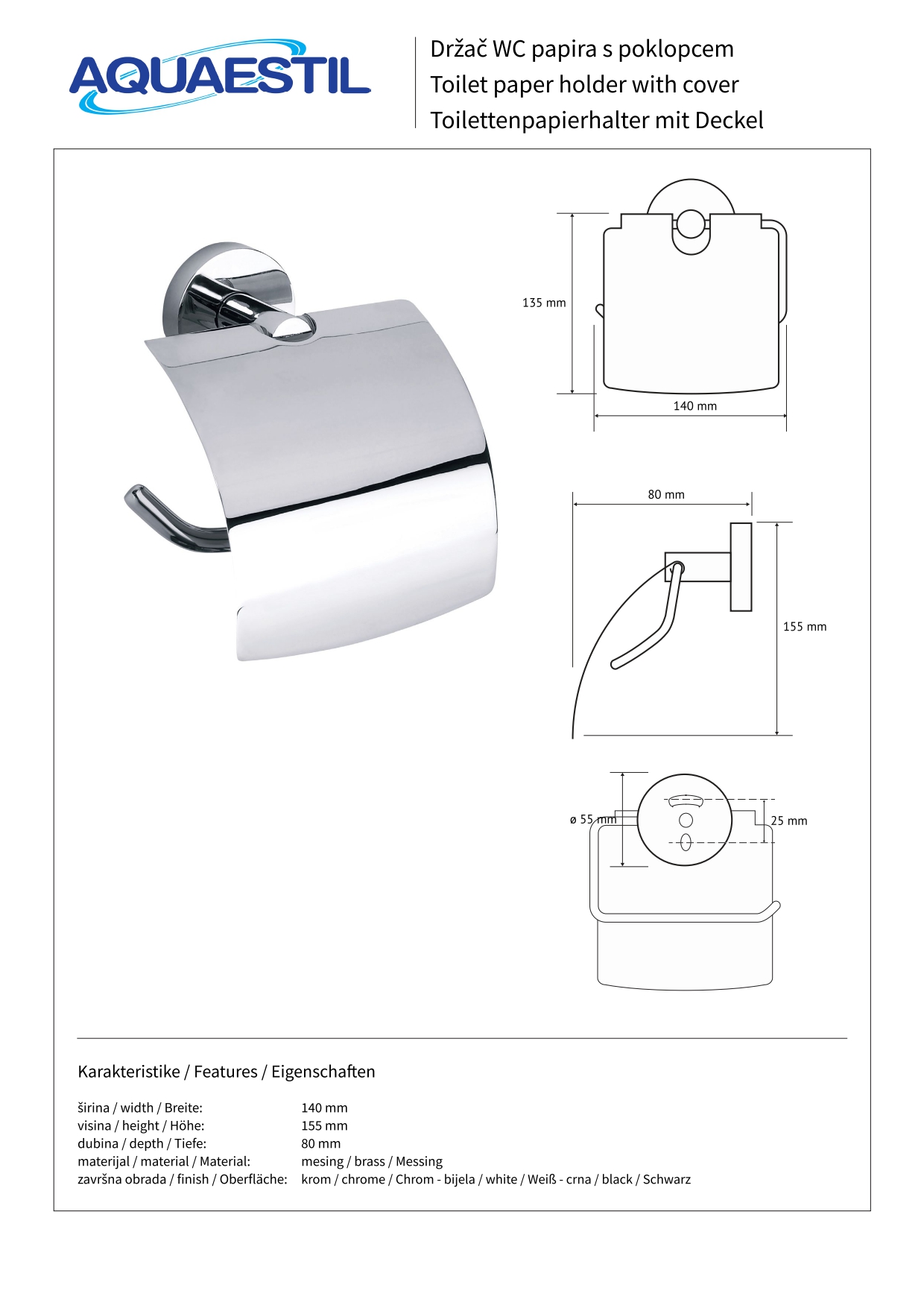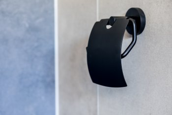 Držalo za toaletni papir s pokrovom, iz medenine v kromiranem, belem mat ali črnem mat učinku.