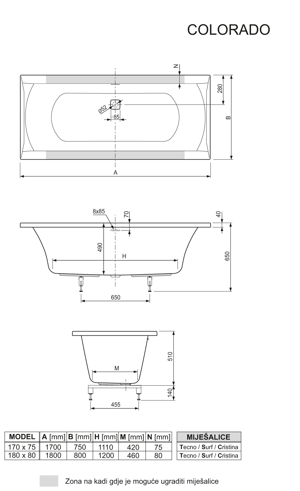 Colorado je elegantna in moderna pravokotna kad. V varianti za obzidavo so vključene nogice in vgrajena odlivno-prelivna garnitura s slot sifonom in kvadratnim klik-klak ventilom sifona.