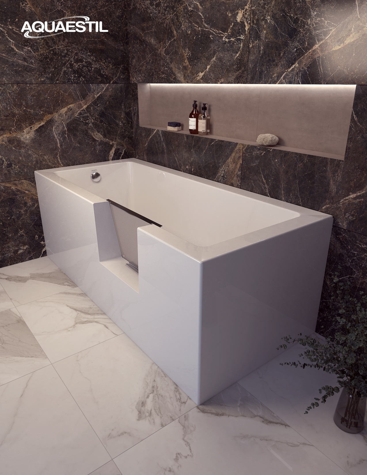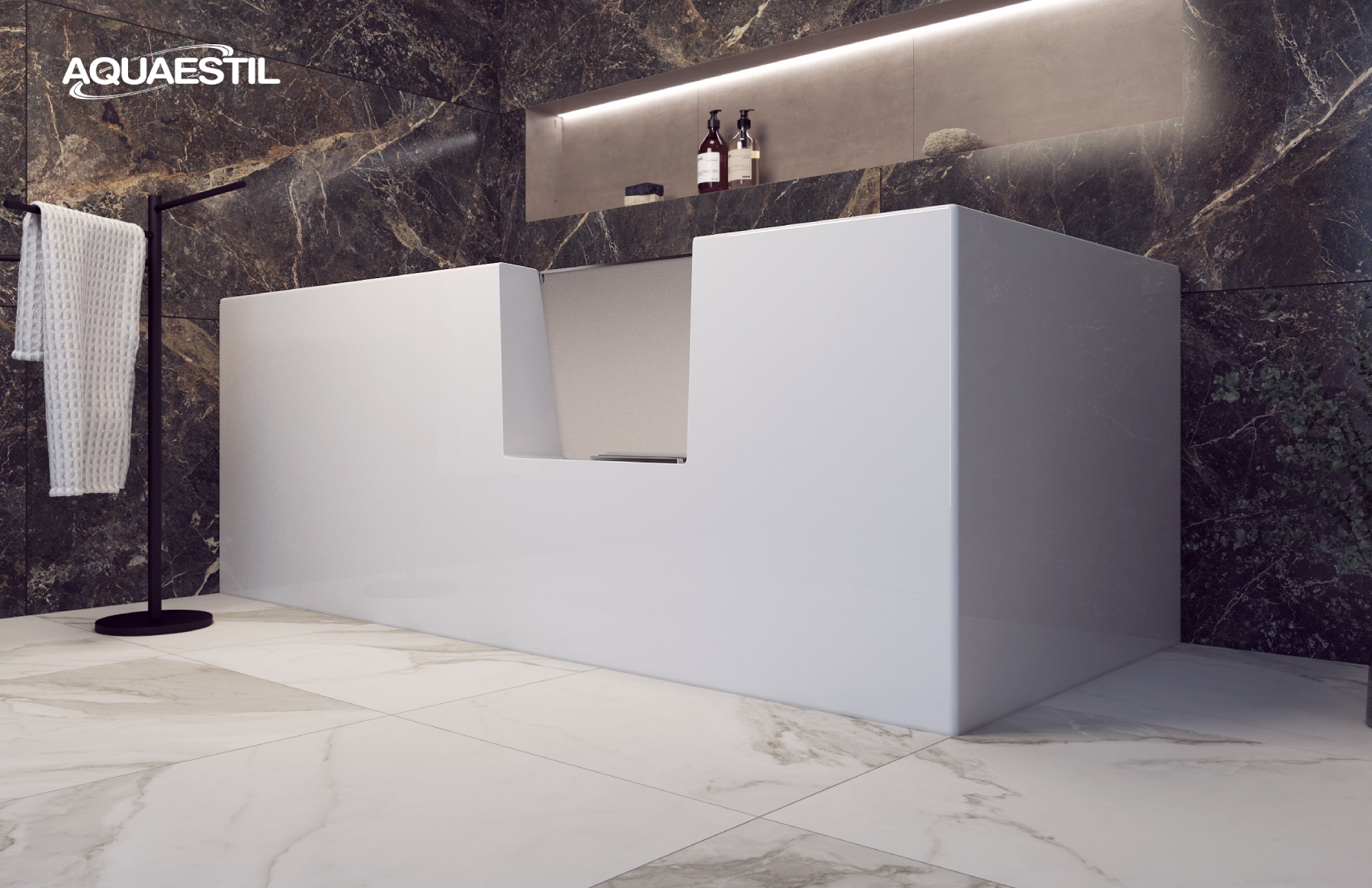 - Kopalna kad se dostavi pripravljena za namestitev s nevidno spojeno oblogo, tovarniški vgrajenim podnožjem in integriranim odtočno-prelivnim kompletom.