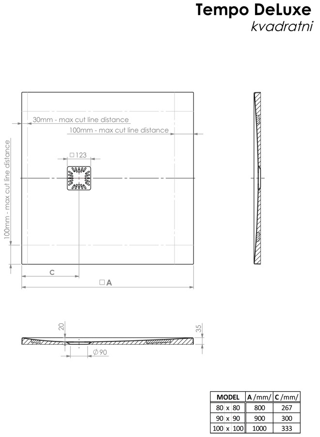 • Tuš kad Tempo DeLuxe je možno krojiti znotraj določenih dimenzij. Ob naročilu tovarniškega razreza je potrebno priložiti skico z označenimi linijami reza.